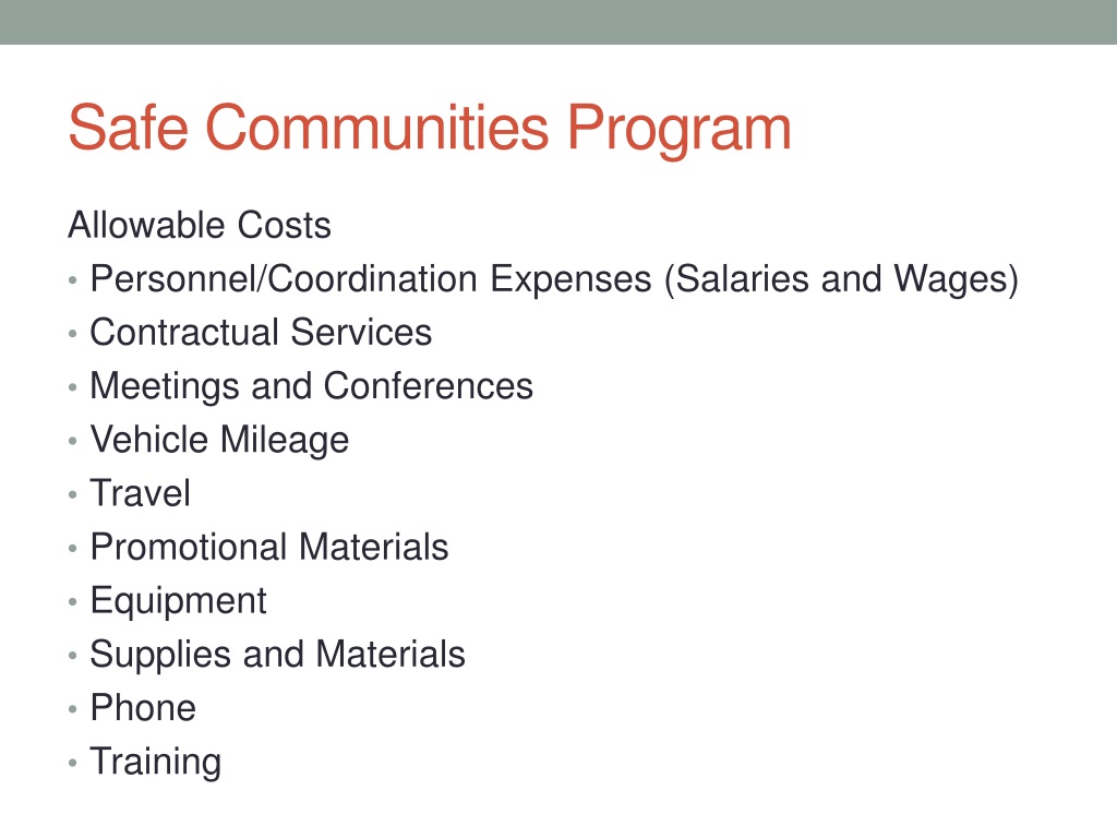 Safe Communities Program Allowable Costs • Personnel/Coordination Expenses (Salaries and Wages) • Contractual Services • Meetings and Conferences • Vehicle Mileage • Travel • Promotional Materials • Equipment • Supplies and Materials • Phone • Training