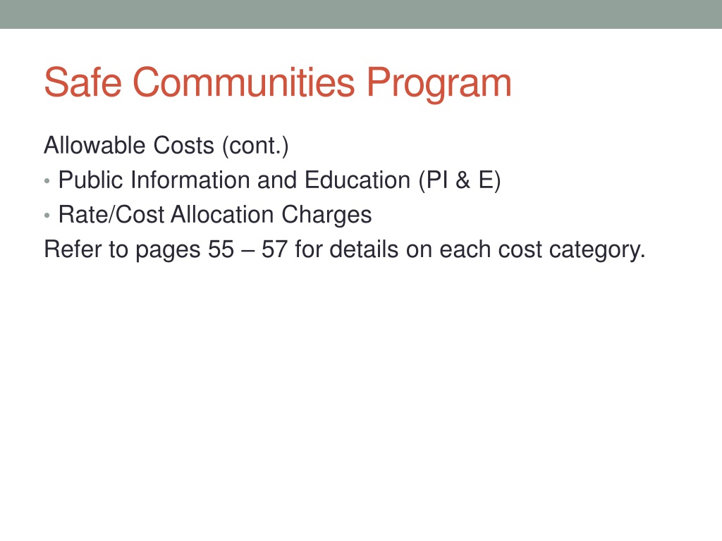 Safe Communities Program Allowable Costs (cont.) • Public Information and Education (PI & E) • Rate/Cost Allocation Charges Refer to pages 55 – 57 for details on each cost category.
