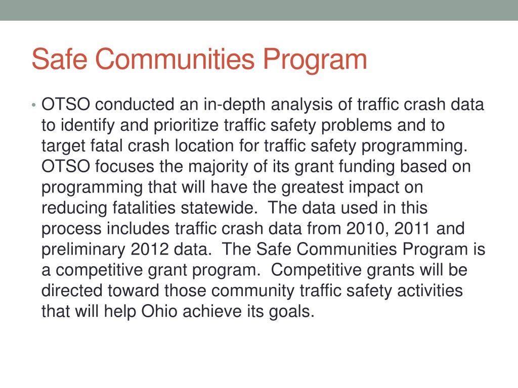 Safe Communities Program • OTSO conducted an in-depth analysis of traffic crash data to identify and prioritize traffic safety problems and to target fatal crash location for traffic safety programming. OTSO focuses the majority of its grant funding based on programming that will have the greatest impact on reducing fatalities statewide. The data used in this process includes traffic crash data from 2010, 2011 and preliminary 2012 data. The Safe Communities Program is a competitive grant program. Competitive grants will be directed toward those community traffic safety activities that will help Ohio achieve its goals.
