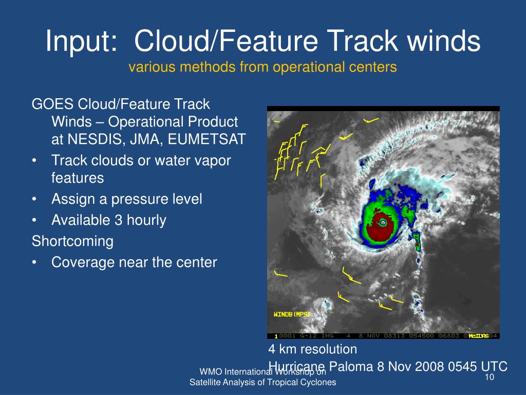 Input: Cloud/Feature Track windsvarious methods from operational centers GOES Cloud/Feature Track Winds – Operational Product at NESDIS, JMA, EUMETSAT • Track clouds or water vapor features • Assign a pressure level • Available 3 hourly Shortcoming • Coverage near the center 4 km resolution Hurricane Paloma 8 Nov 2008 0545 UTC WMO International Workshop on Satellite Analysis of Tropical Cyclones