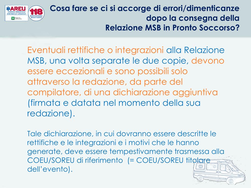 Cosa fare se ci si accorge di errori/dimenticanze dopo la consegna della Relazione MSB in Pronto Soccorso? Eventuali rettifiche o integrazioni alla Relazione MSB, una volta separate le due copie, devono essere eccezionali e sono possibili solo attraverso la redazione, da parte del compilatore, di una dichiarazione aggiuntiva (firmata e datata nel momento della sua redazione). Tale dichiarazione, in cui dovranno essere descritte le rettifiche e le integrazioni e i motivi che le hanno generate, deve essere tempestivamente trasmessa alla COEU/SOREU di riferimento (= COEU/SOREU titolare dell’evento).