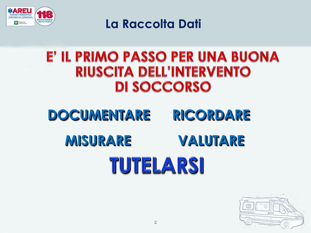 La Raccolta Dati E’ IL PRIMO PASSO PER UNA BUONA RIUSCITA DELL’INTERVENTO DI SOCCORSO DOCUMENTARE RICORDARE MISURARE VALUTARE TUTELARSI