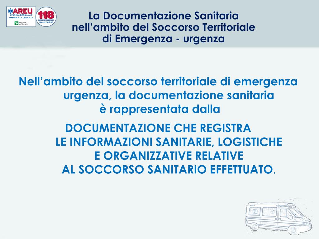 La Documentazione Sanitaria nell’ambito del Soccorso Territoriale di Emergenza - urgenza Nell’ambito del soccorso territoriale di emergenza urgenza, la documentazione sanitaria è rappresentata dalla DOCUMENTAZIONE CHE REGISTRA LE INFORMAZIONI SANITARIE, LOGISTICHE E ORGANIZZATIVE RELATIVE AL SOCCORSO SANITARIO EFFETTUATO.
