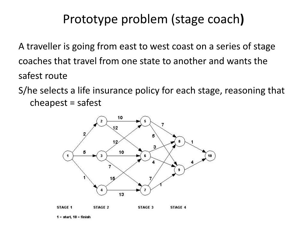 Prototype problem (stage coach) A traveller is going from east to west coast on a series of stage coaches that travel from one state to another and wants the safest route S/he selects a life insurance policy for each stage, reasoning that cheapest = safest