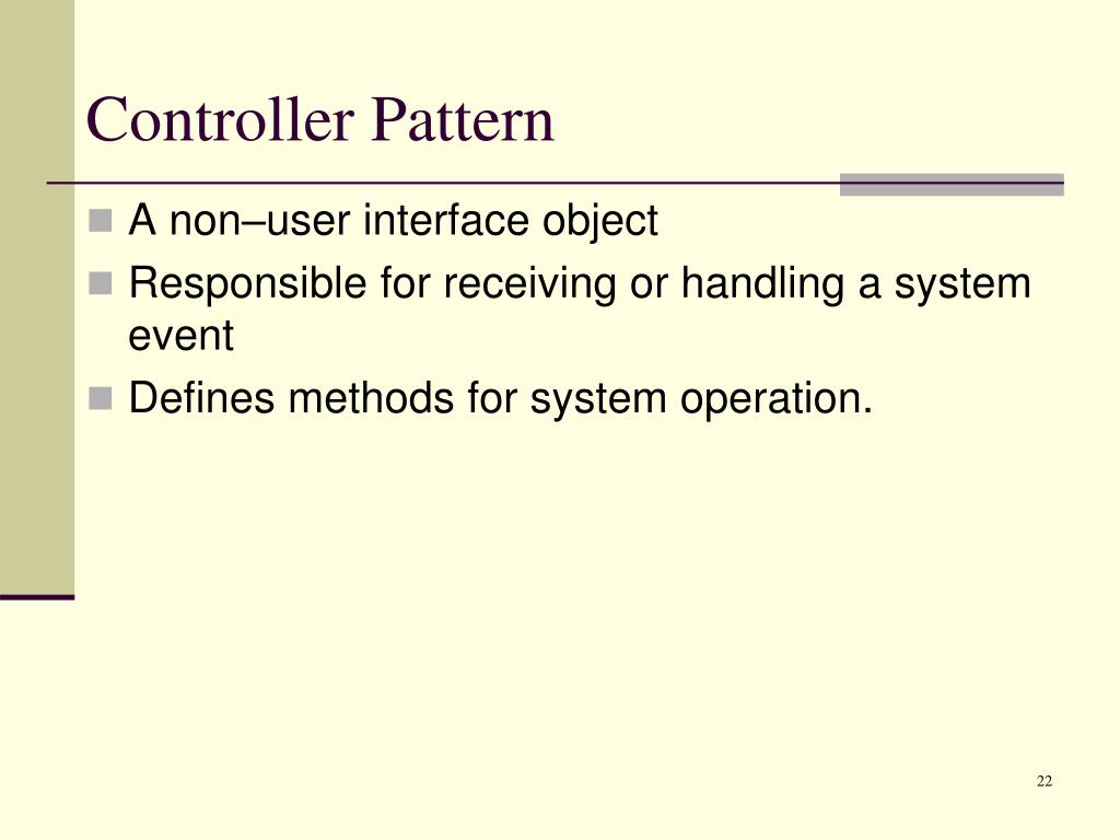 Controller Pattern • A non–user interface object • Responsible for receiving or handling a system event • Defines methods for system operation.
