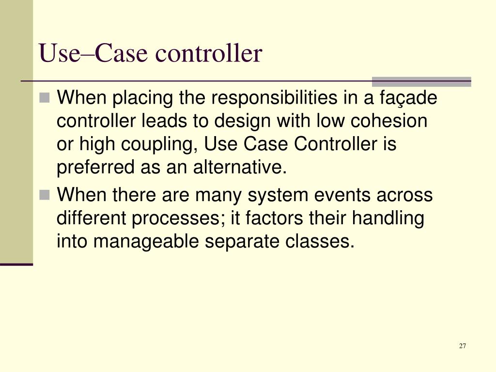 Use–Case controller • When placing the responsibilities in a façade controller leads to design with low cohesion or high coupling, Use Case Controller is preferred as an alternative. • When there are many system events across different processes; it factors their handling into manageable separate classes.