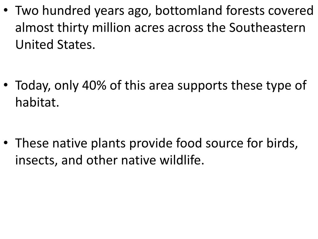 Two hundred years ago, bottomland forests covered almost thirty million acres across the Southeastern United States. • Today, only 40% of this area supports these type of habitat. • These native plants provide food source for birds, insects, and other native wildlife.