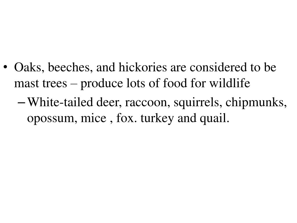 Oaks, beeches, and hickories are considered to be mast trees – produce lots of food for wildlife • White-tailed deer, raccoon, squirrels, chipmunks, opossum, mice , fox. turkey and quail.