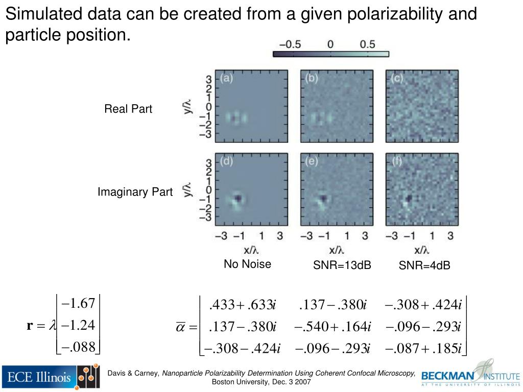 Simulated data can be created from a given polarizability and particle position. Real Part Imaginary Part No Noise SNR=13dB SNR=4dB Davis & Carney, Nanoparticle Polarizability Determination Using Coherent Confocal Microscopy, Boston University, Dec. 3 2007