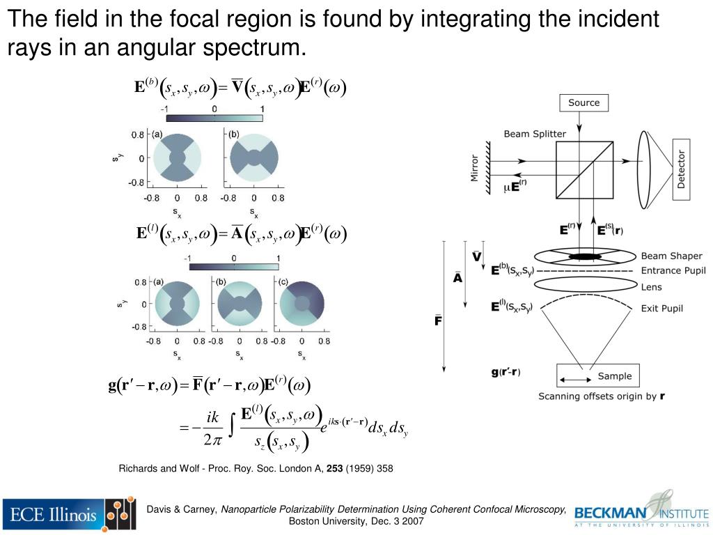 The field in the focal region is found by integrating the incident rays in an angular spectrum. Richards and Wolf - Proc. Roy. Soc. London A, 253 (1959) 358 Davis & Carney, Nanoparticle Polarizability Determination Using Coherent Confocal Microscopy, Boston University, Dec. 3 2007