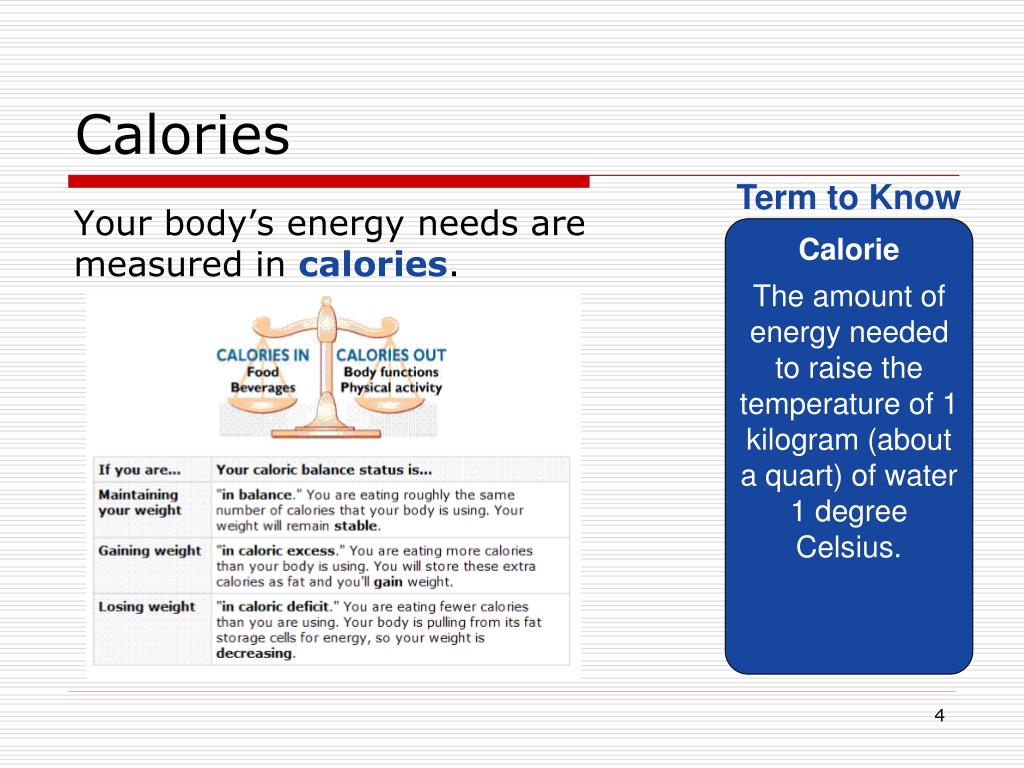 Term to Know Calorie The amount of energy needed to raise the temperature of 1 kilogram (about a quart) of water 1 degree Celsius. Calories Your body’s energy needs are measured in calories.