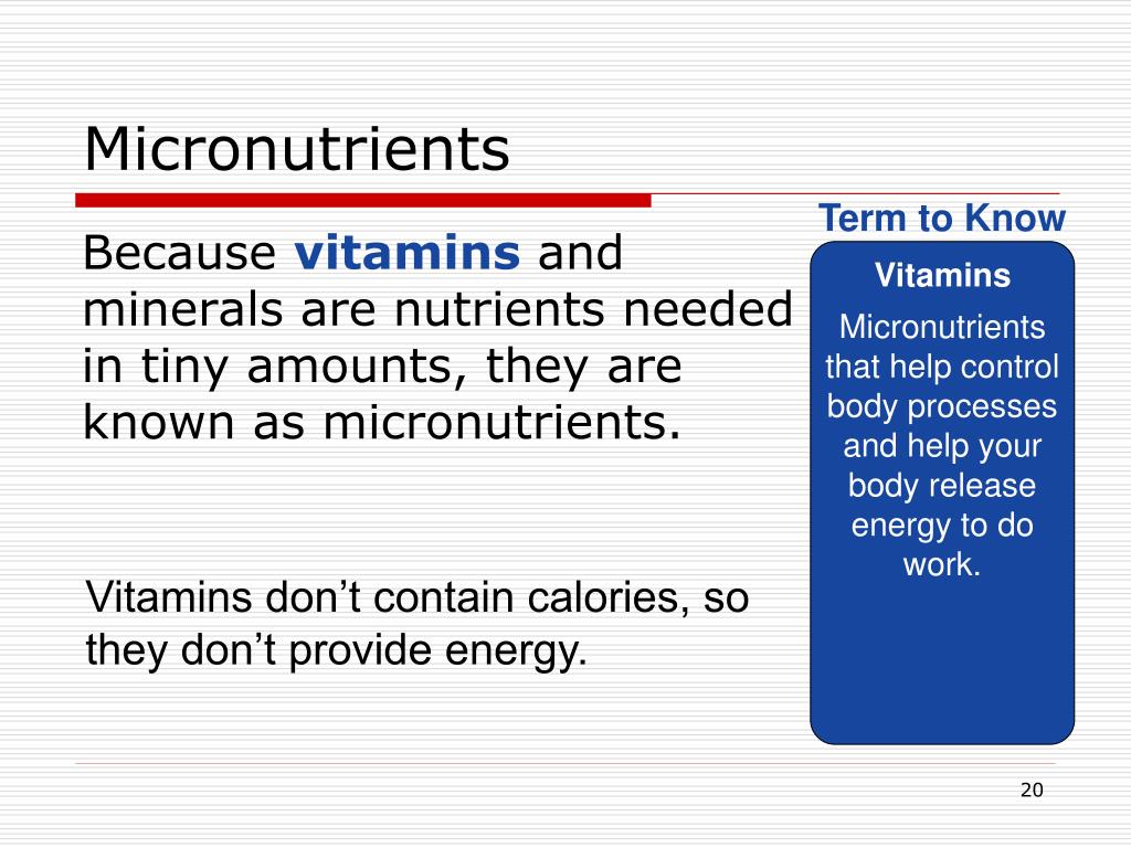 Term to Know Vitamins Micronutrients that help control body processes and help your body release energy to do work. Micronutrients Because vitamins and minerals are nutrients needed in tiny amounts, they are known as micronutrients. Vitamins don’t contain calories, so they don’t provide energy.