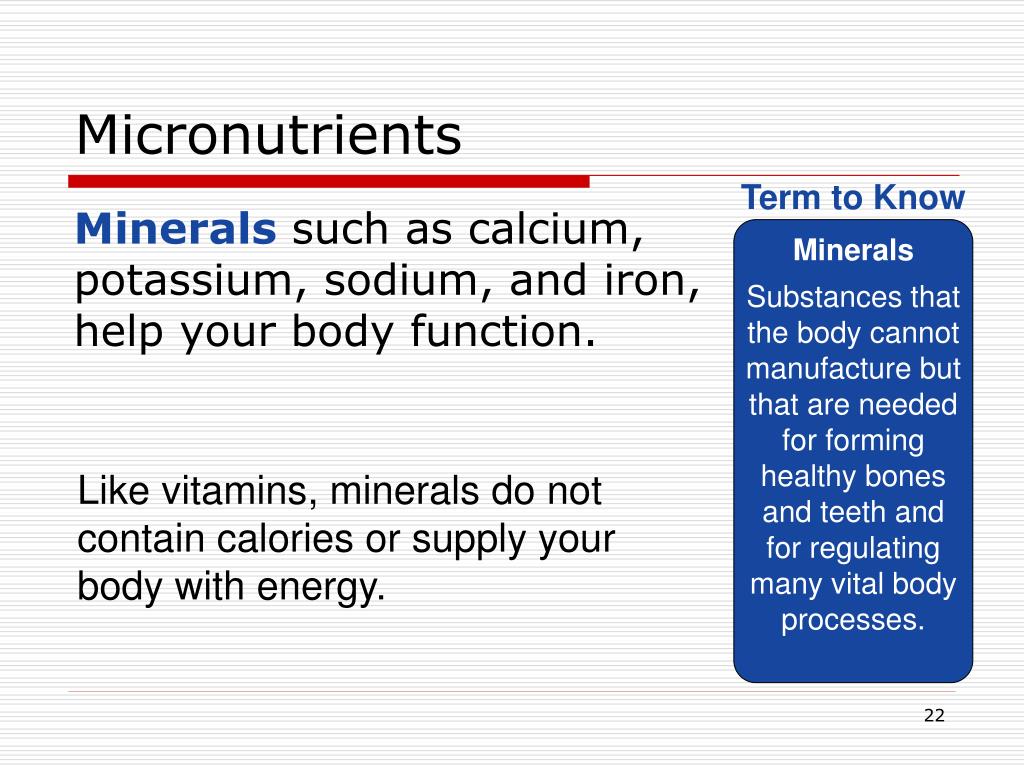 Term to Know Minerals Substances that the body cannot manufacture but that are needed for forming healthy bones and teeth and for regulating many vital body processes. Micronutrients Minerals such as calcium, potassium, sodium, and iron, help your body function. Like vitamins, minerals do not contain calories or supply your body with energy.