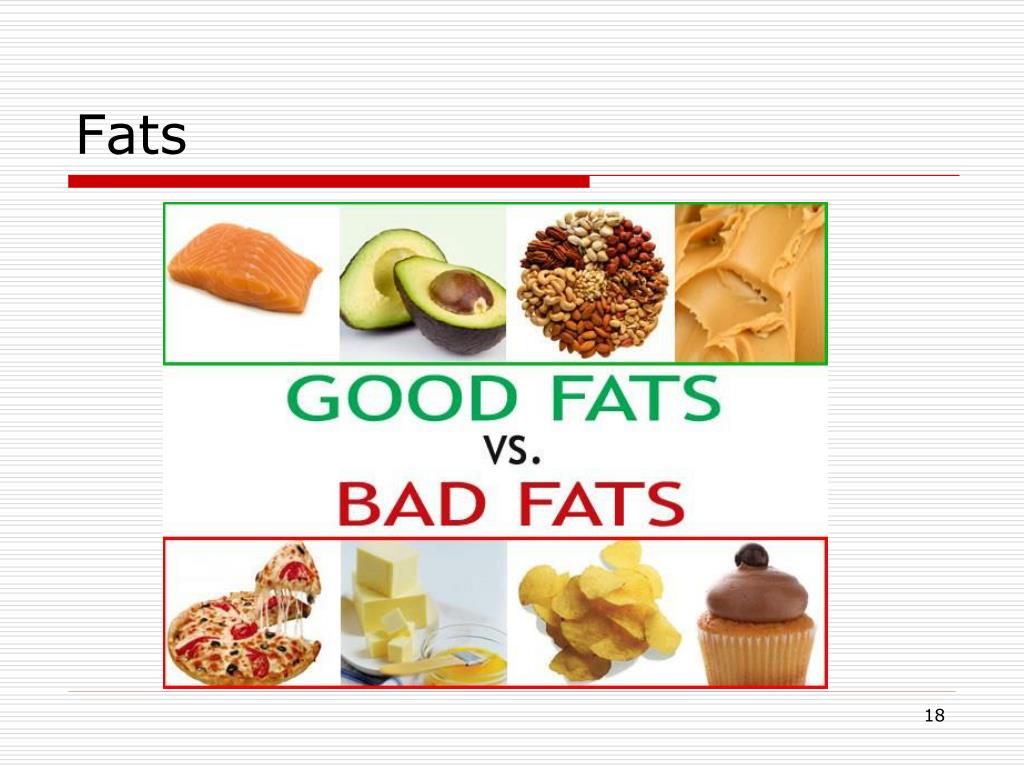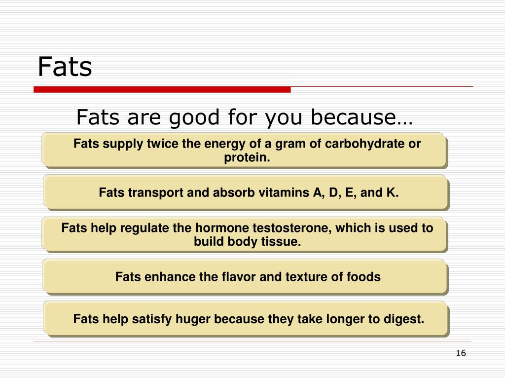 Fats Fats are good for you because… Fats supply twice the energy of a gram of carbohydrate or protein. Fats transport and absorb vitamins A, D, E, and K. Fats help regulate the hormone testosterone, which is used to build body tissue. Fats enhance the flavor and texture of foods Fats help satisfy huger because they take longer to digest.