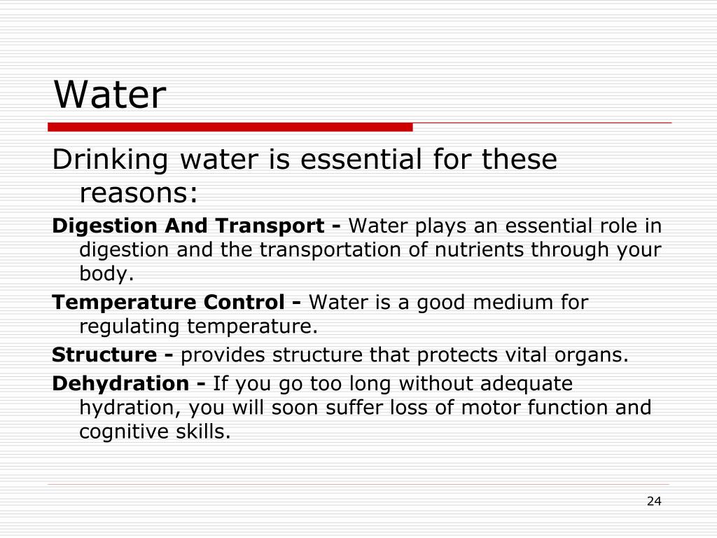 Water Drinking water is essential for these reasons: Digestion And Transport - Water plays an essential role in digestion and the transportation of nutrients through your body. Temperature Control - Water is a good medium for regulating temperature. Structure - provides structure that protects vital organs. Dehydration - If you go too long without adequate hydration, you will soon suffer loss of motor function and cognitive skills.