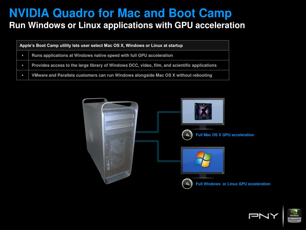 NVIDIA Quadro for Mac and Boot CampRun Windows or Linux applications with GPU acceleration Full Mac OS X GPU acceleration Full Windows or Linux GPU acceleration