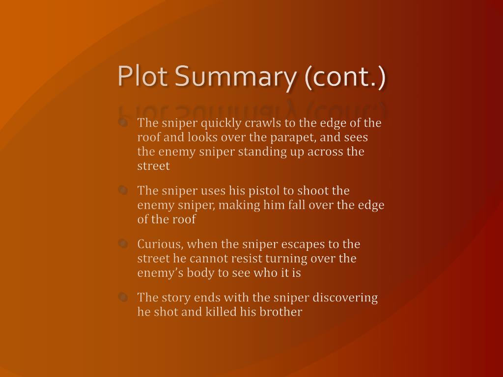 Plot Summary (cont.) • The sniper quickly crawls to the edge of the roof and looks over the parapet, and sees the enemy sniper standing up across the street • The sniper uses his pistol to shoot the enemy sniper, making him fall over the edge of the roof • Curious, when the sniper escapes to the street he cannot resist turning over the enemy’s body to see who it is • The story ends with the sniper discovering he shot and killed his brother