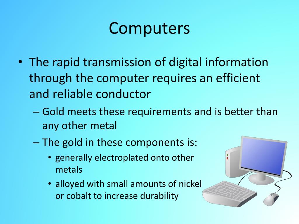 Computers • The rapid transmission of digital information through the computer requires an efficient and reliable conductor • Gold meets these requirements and is better than any other metal • The gold in these components is: • generally electroplated onto other metals • alloyed with small amounts of nickel or cobalt to increase durability