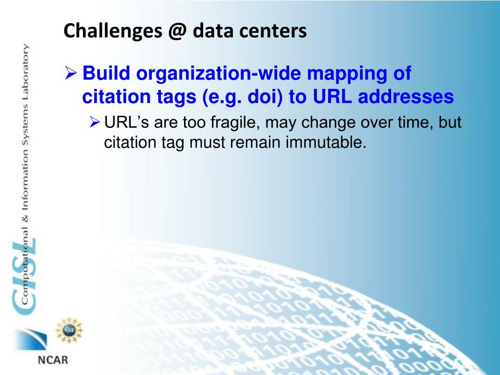 Challenges @ data centers • Build organization-wide mapping of citation tags (e.g. doi) to URL addresses • URL’s are too fragile, may change over time, but citation tag must remain immutable.