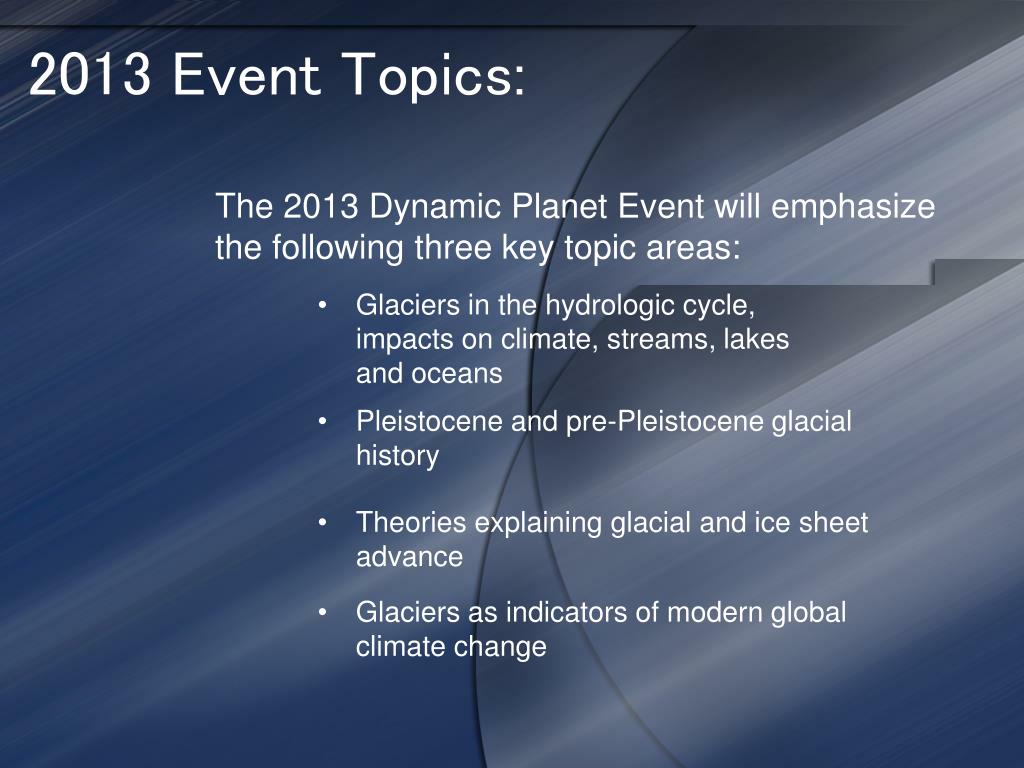 2013 Event Topics: The 2013 Dynamic Planet Event will emphasize the following three key topic areas: • Glaciers in the hydrologic cycle, impacts on climate, streams, lakes and oceans • Pleistocene and pre-Pleistocene glacial history • Theories explaining glacial and ice sheet advance • Glaciers as indicators of modern global climate change