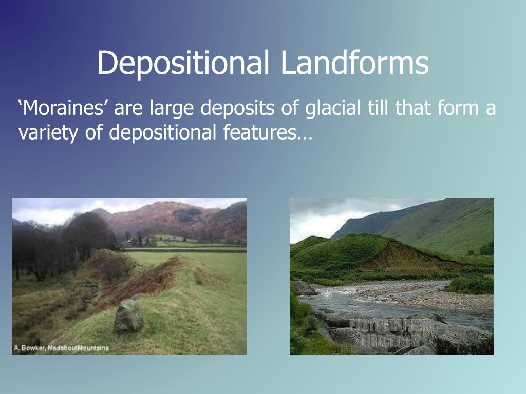 Depositional Landforms ‘Moraines’ are large deposits of glacial till that form a variety of depositional features…