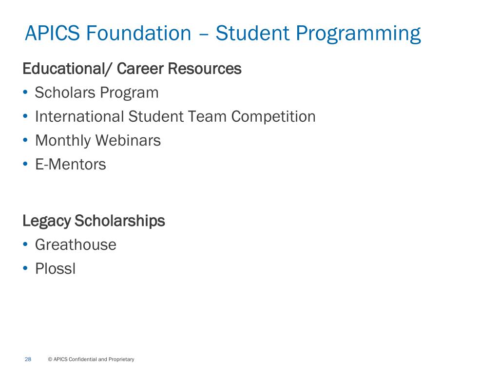 APICS Foundation – Student Programming Educational/ Career Resources • Scholars Program • International Student Team Competition • Monthly Webinars • E-Mentors Legacy Scholarships • Greathouse • Plossl