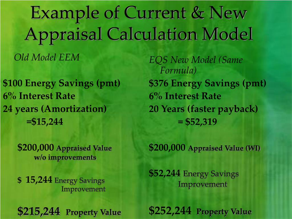 Old Model EEM $100 Energy Savings (pmt) 6% Interest Rate 24 years (Amortization) =$15,244 $200,000Appraised Value w/o improvements $ 15,244Energy Savings Improvement $215,244 Property Value EQS New Model (Same Formula) $376 Energy Savings (pmt) 6% Interest Rate 20 Years (faster payback) = $52,319 $200,000 Appraised Value (WI) $52,244 Energy Savings Improvement $252,244Property Value Example of Current & New Appraisal Calculation Model