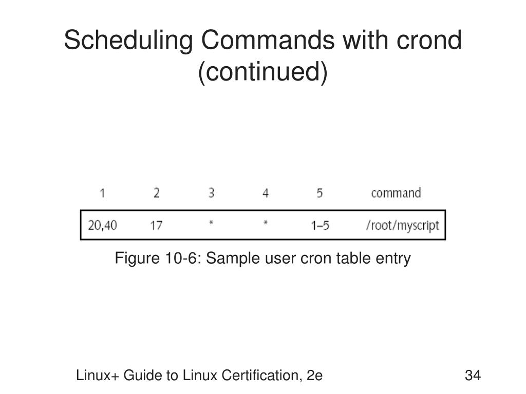 Scheduling Commands • at daemon (atd): System daemon that executes tasks at a future time • cron daemon (crond): System daemon that executes tasks repetitively in the future Linux+ Guide to Linux Certification, 2e