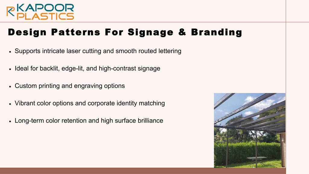 Design Patterns For Signage & Branding Design Patterns For Signage & Branding • Supports intricate laser cutting and smooth routed lettering • Ideal for backlit, edge-lit, and high-contrast signage • Custom printing and engraving options • Vibrant color options and corporate identity matching • Long-term color retention and high surface brilliance