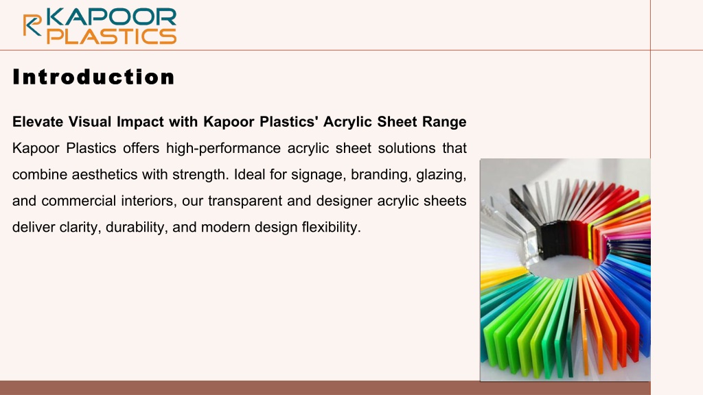 Introduction Introduction Elevate Visual Impact with Kapoor Plastics' Acrylic Sheet Range Kapoor Plastics offers high-performance acrylic sheet solutions that combine aesthetics with strength. Ideal for signage, branding, glazing, and commercial interiors, our transparent and designer acrylic sheets deliver clarity, durability, and modern design flexibility.