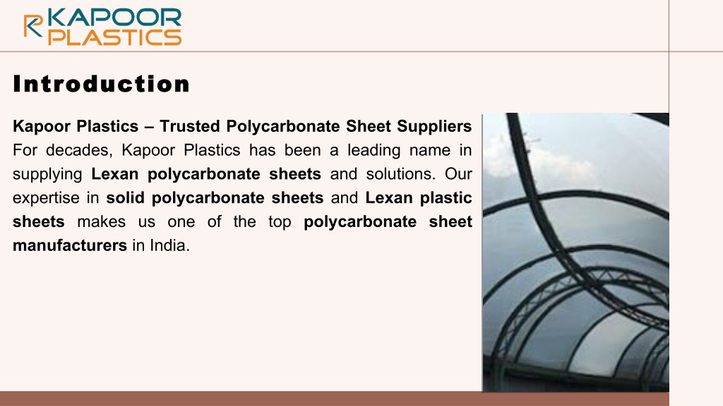 Introduction Introduction Kapoor Plastics – Trusted Polycarbonate Sheet Suppliers For decades, Kapoor Plastics has been a leading name in supplying Lexan polycarbonate sheets and solutions. Our expertise in solid polycarbonate sheets and Lexan plastic sheets makes us one of the top polycarbonate sheet manufacturers in India.