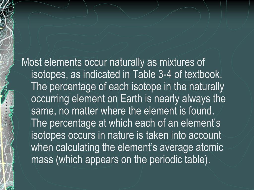 Most elements occur naturally as mixtures of isotopes, as indicated in Table 3-4 of textbook. The percentage of each isotope in the naturally occurring element on Earth is nearly always the same, no matter where the element is found. The percentage at which each of an element’s isotopes occurs in nature is taken into account when calculating the element’s average atomic mass (which appears on the periodic table).