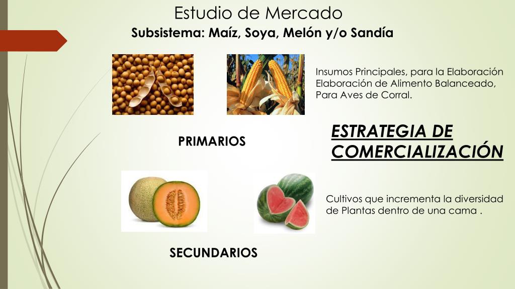 Estudio de Mercado Subsistema: Maíz, Soya, Melón y/o Sandía Insumos Principales, para la Elaboración Elaboración de Alimento Balanceado, Para Aves de Corral. ESTRATEGIA DE COMERCIALIZACIÓN PRIMARIOS Cultivos que incrementa la diversidad de Plantas dentro de una cama . SECUNDARIOS