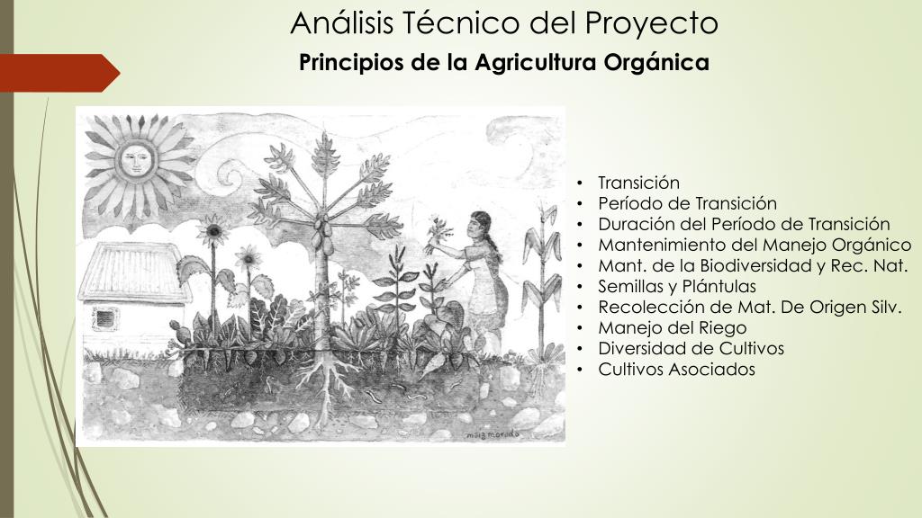 Análisis Técnico del Proyecto Principios de la Agricultura Orgánica • Transición • Período de Transición • Duración del Período de Transición • Mantenimiento del Manejo Orgánico • Mant. de la Biodiversidad y Rec. Nat. • Semillas y Plántulas • Recolección de Mat. De Origen Silv. • Manejo del Riego • Diversidad de Cultivos • Cultivos Asociados
