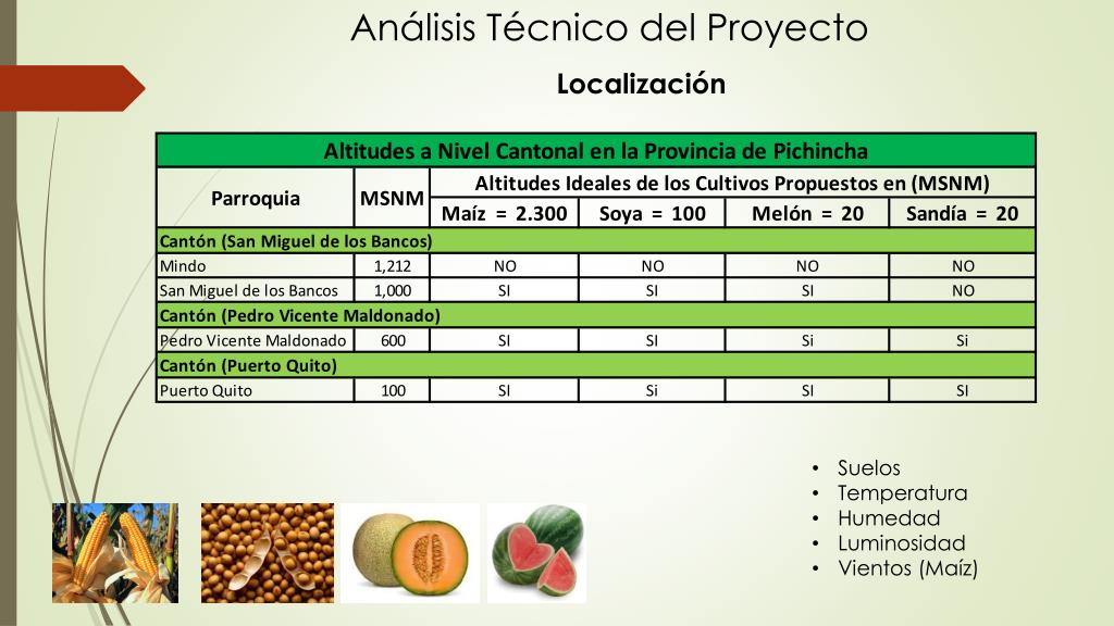 Análisis Técnico del Proyecto Localización • Suelos • Temperatura • Humedad • Luminosidad • Vientos (Maíz)