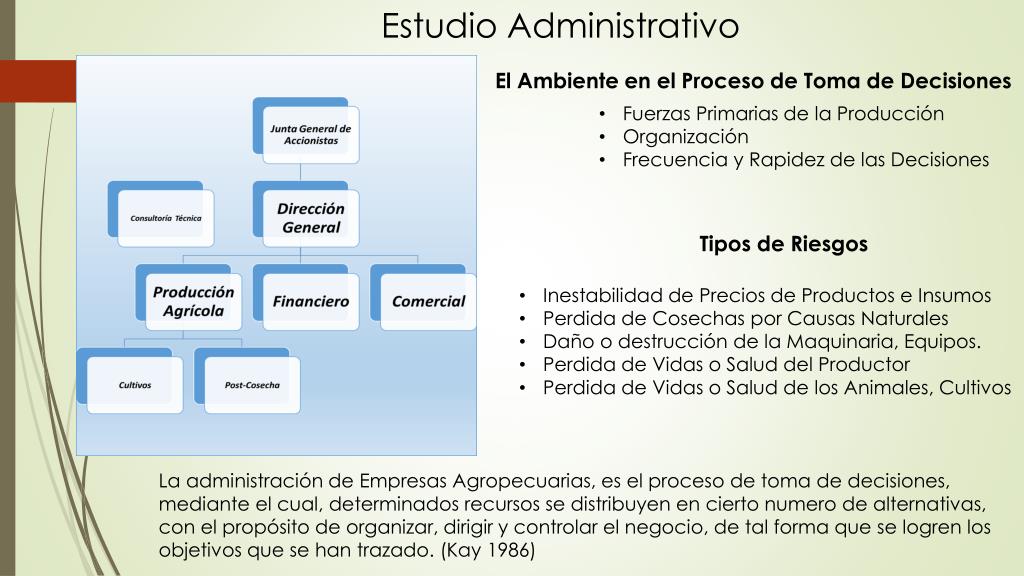 Estudio Administrativo El Ambiente en el Proceso de Toma de Decisiones • Fuerzas Primarias de la Producción • Organización • Frecuencia y Rapidez de las Decisiones Tipos de Riesgos • Inestabilidad de Precios de Productos e Insumos • Perdida de Cosechas por Causas Naturales • Daño o destrucción de la Maquinaria, Equipos. • Perdida de Vidas o Salud del Productor • Perdida de Vidas o Salud de los Animales, Cultivos La administración de Empresas Agropecuarias, es el proceso de toma de decisiones, mediante el cual, determinados recursos se distribuyen en cierto numero de alternativas, con el propósito de organizar, dirigir y controlar el negocio, de tal forma que se logren los objetivos que se han trazado. (Kay 1986)