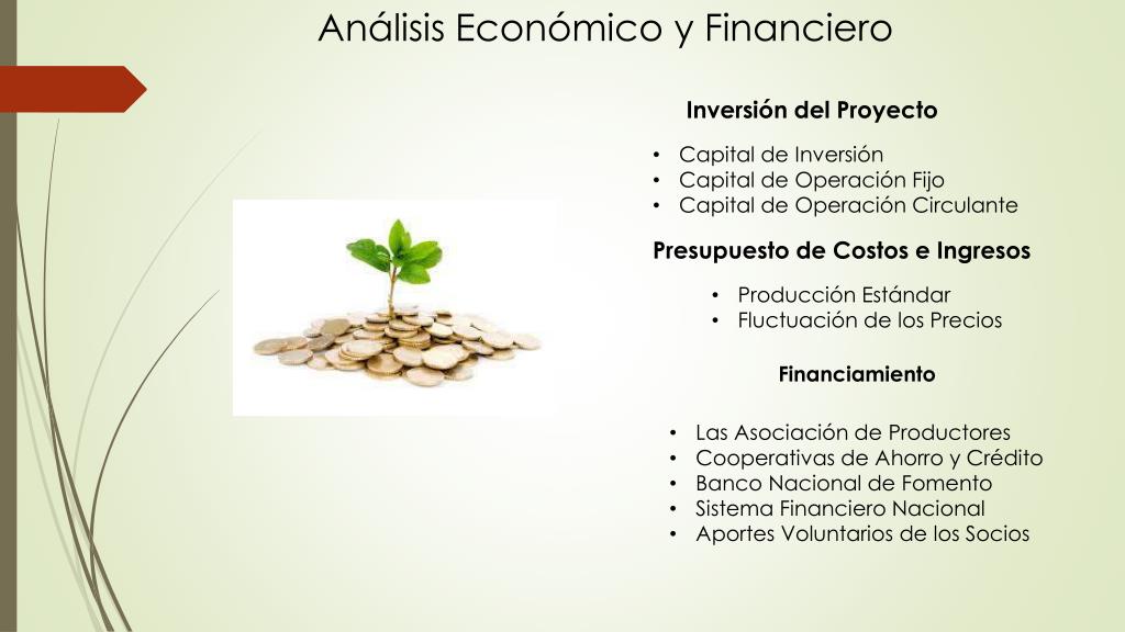 Análisis Económico y Financiero Inversión del Proyecto • Capital de Inversión • Capital de Operación Fijo • Capital de Operación Circulante Presupuesto de Costos e Ingresos • Producción Estándar • Fluctuación de los Precios Financiamiento • Las Asociación de Productores • Cooperativas de Ahorro y Crédito • Banco Nacional de Fomento • Sistema Financiero Nacional • Aportes Voluntarios de los Socios