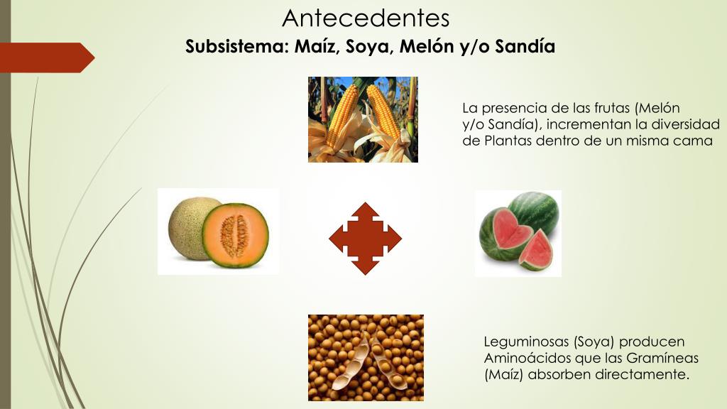 Antecedentes Subsistema: Maíz, Soya, Melón y/o Sandía La presencia de las frutas (Melón y/o Sandía), incrementan la diversidad de Plantas dentro de un misma cama Leguminosas (Soya) producen Aminoácidos que las Gramíneas (Maíz) absorben directamente.
