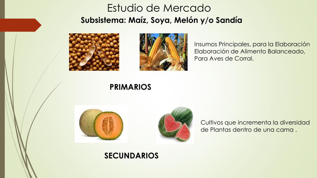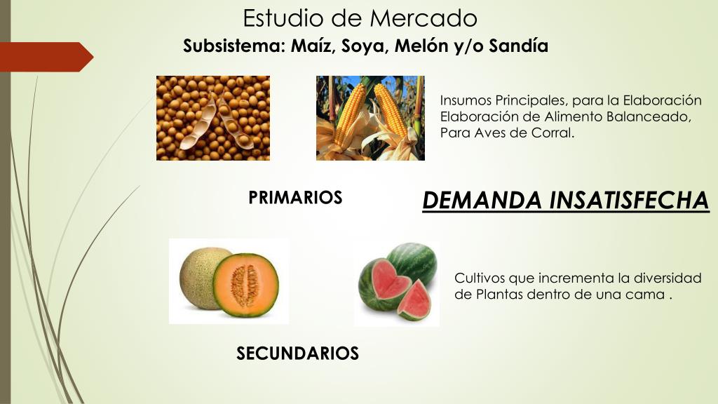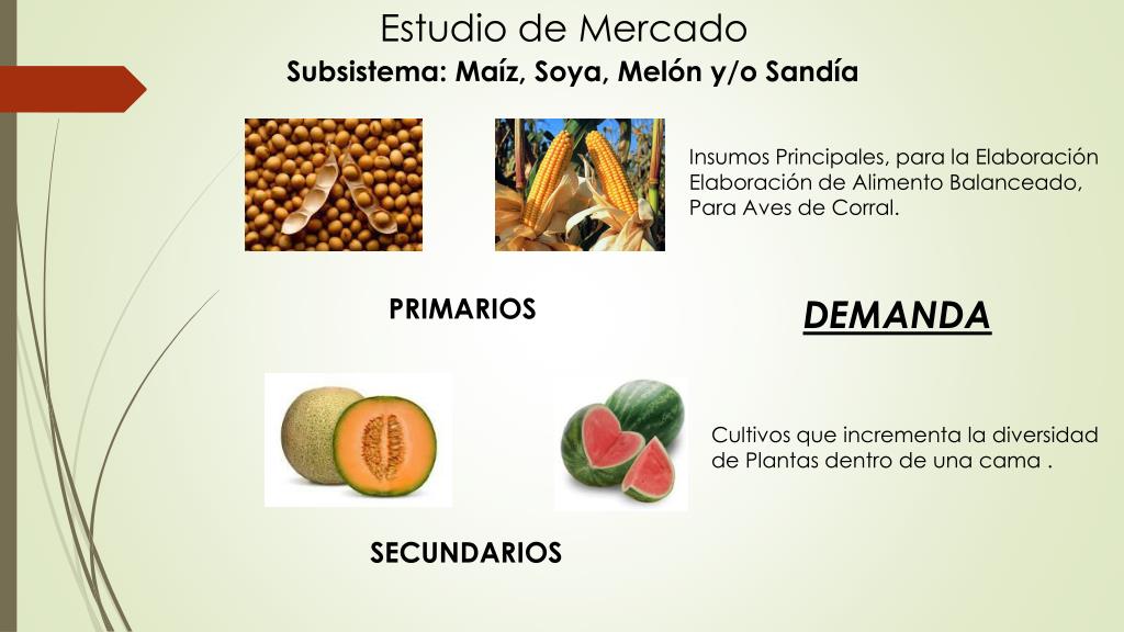 Estudio de Mercado Subsistema: Maíz, Soya, Melón y/o Sandía Insumos Principales, para la Elaboración Elaboración de Alimento Balanceado, Para Aves de Corral. DEMANDA INSATISFECHA PRIMARIOS Cultivos que incrementa la diversidad de Plantas dentro de una cama . SECUNDARIOS