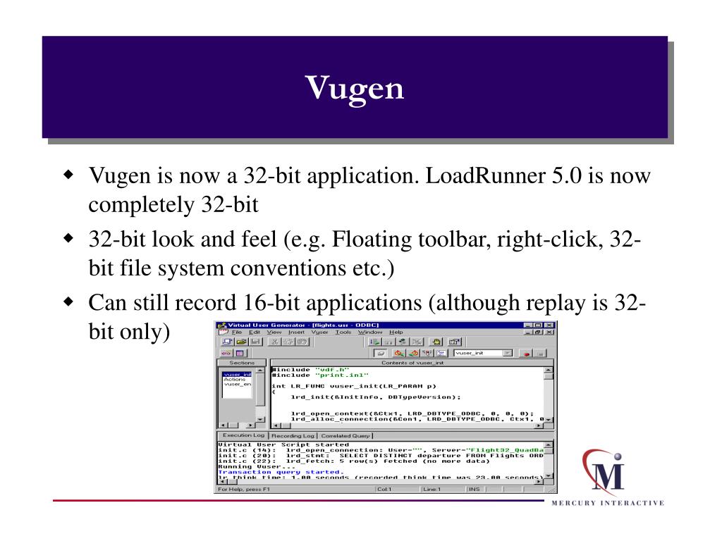 Vugen • Vugen is now a 32-bit application. LoadRunner 5.0 is now completely 32-bit • 32-bit look and feel (e.g. Floating toolbar, right-click, 32-bit file system conventions etc.) • Can still record 16-bit applications (although replay is 32-bit only)