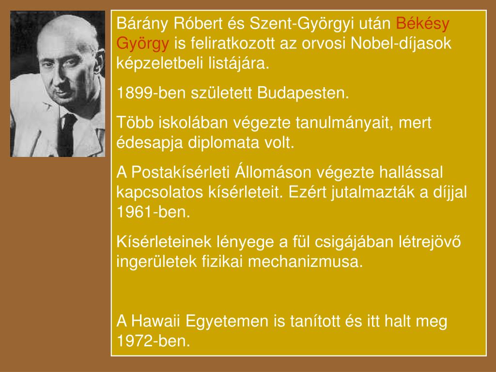 Bárány Róbert és Szent-Györgyi után Békésy György is feliratkozott az orvosi Nobel-díjasok képzeletbeli listájára. 1899-ben született Budapesten. Több iskolában végezte tanulmányait, mert édesapja diplomata volt. A Postakísérleti Állomáson végezte hallással kapcsolatos kísérleteit.Ezért jutalmazták a díjjal 1961-ben. Kísérleteinek lényege a fül csigájában létrejövő ingerületek fizikai mechanizmusa. A Hawaii Egyetemen is tanított és itt halt meg 1972-ben.