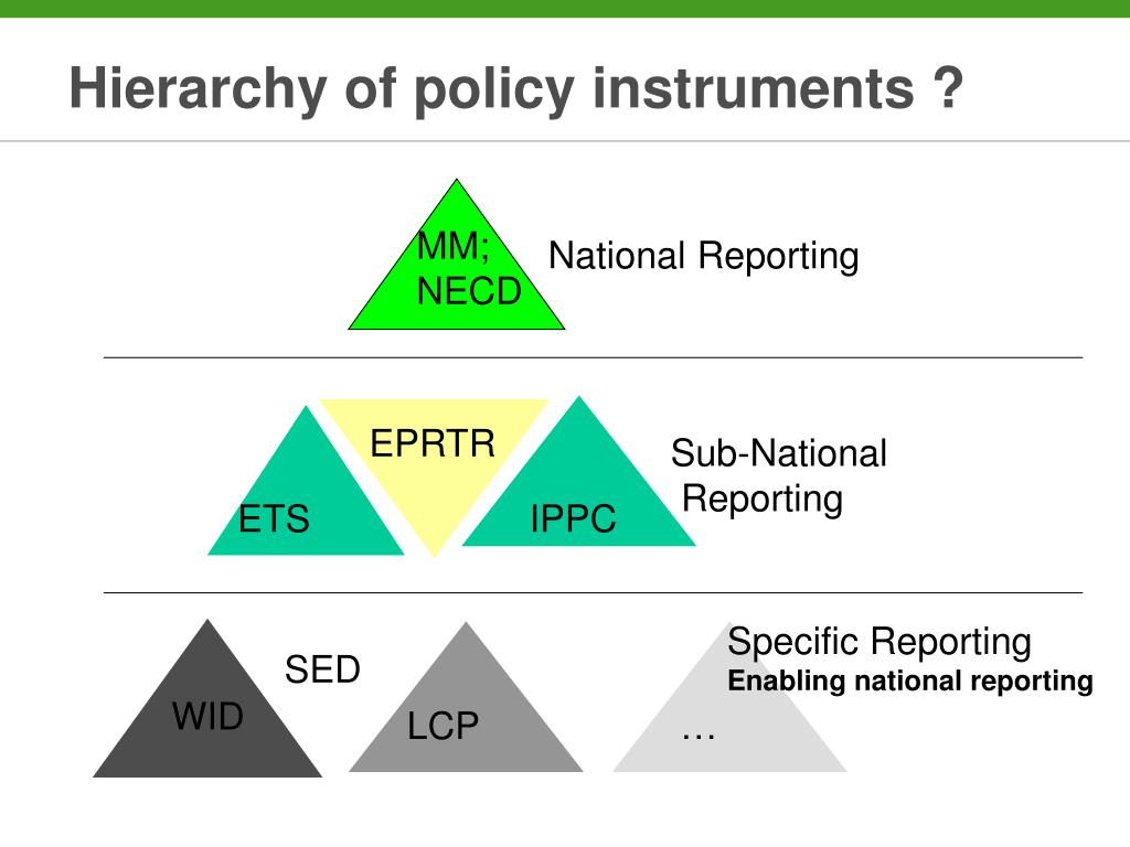 Hierarchy of policy instruments ? MM; NECD National Reporting EPRTR Sub-National Reporting ETS IPPC Specific Reporting Enabling national reporting SED WID LCP …