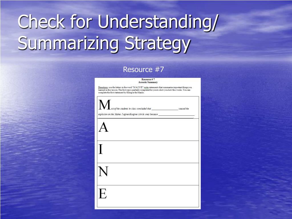 Think-Pair-Share(Resource #6) • The Sampson Board of Inquiry (1898) Headed by Captain William T. Sampson, United States Navy. Finding: The Maine had been blown up by a mine, which in turn caused the explosion of her forward magazines. “The court has been unable to obtain evidence fixing the responsibility for the destruction of the Maine upon any person or persons.” • Spanish Commission (1898) Finding: The explosion on the Maine was caused internally, probably due to an accident. • Vreeland Court of Inquiry (1911) Headed by Rear Admiral Charles E. Vreeland, United States Navy. Finding The explosion of the magazines on the Maine was triggered by an external blast, but the damage to the ship was much more extensive than the Sampson Board had thought. The blast occurred further aft on the ship. • Rickover Investigation (1976) Began as a result of interest on the part of Admiral Hyman G. Rickover, United States Navy. Mr. Ib S. Hansen of the David W. Taylor Naval Ship Research and Development Center and Mr. Robert S. Price of the Naval Surface Weapons Center volunteered to look at the evidence. Finding The explosion of the magazines was caused by a coal bunker fire, which had heated the magazines to the point of explosion. “There is no evidence that a mine destroyed the Maine.” • National Geographic Investigation (1999) National Geographic commissioned Advanced Marine Enterprises as part of a centennial article. Finding“[I]t appears more probable than was previously concluded that a mine caused the inward bent bottom structure and the detonation of the magazines.”