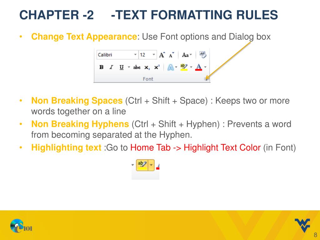 Chapter -2 -Text formatting rules • Change Text Appearance: Use Font options and Dialog box • Non Breaking Spaces (Ctrl + Shift + Space) : Keeps two or more words together on a line • Non Breaking Hyphens (Ctrl + Shift + Hyphen) : Prevents a word from becoming separated at the Hyphen. • Highlighting text :Go to Home Tab -> Highlight Text Color (in Font)