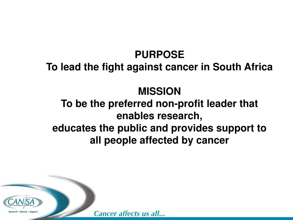 PURPOSETo lead the fight against cancer in South AfricaMISSIONTo be the preferred non-profit leader that enables research, educates the public and provides support to all people affected by cancer