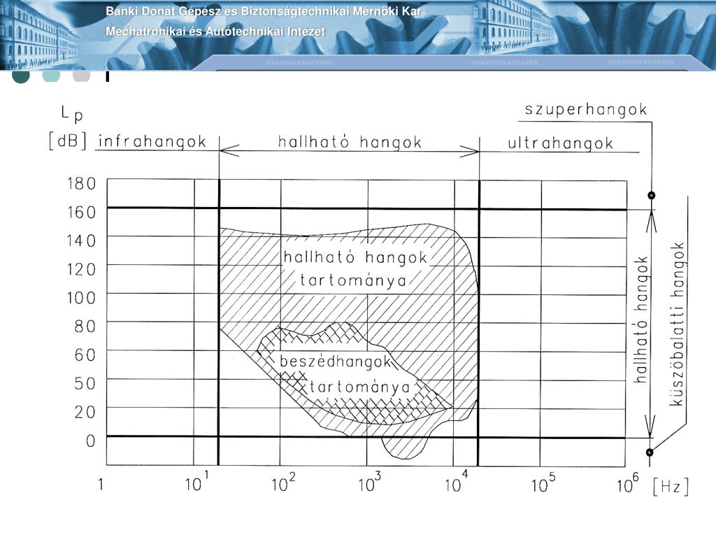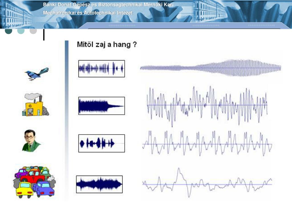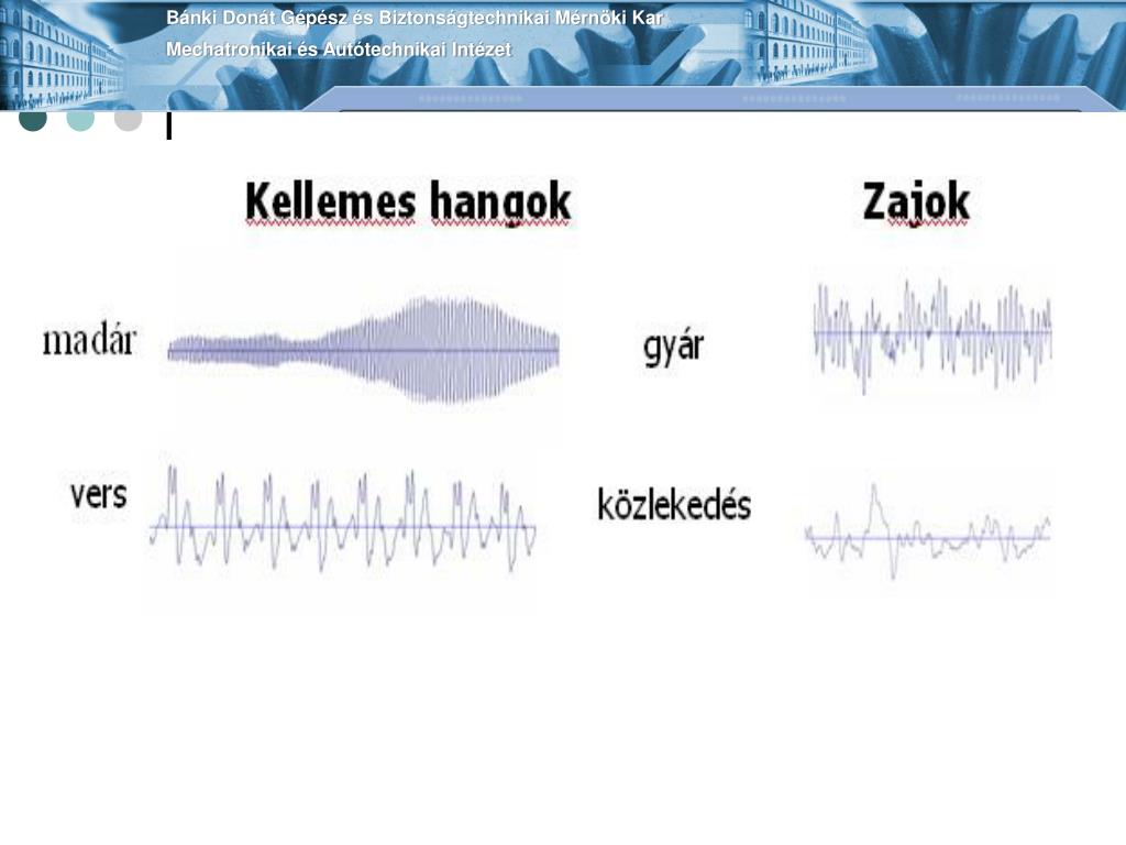 Bánki Donát Gépész és Biztonságtechnikai Mérnöki KarMechatronikai és Autótechnikai Intézet A hang három jelentéstartalma • Fizikai jelenség , mechanikai hullámok, tovaterjedés, rezgés • Élettani (biológiai) jelenségek (hallásküszöb, fájdalomküszöb) • Értelmi, esztétikai (lélektani) jelenségek (zaj)