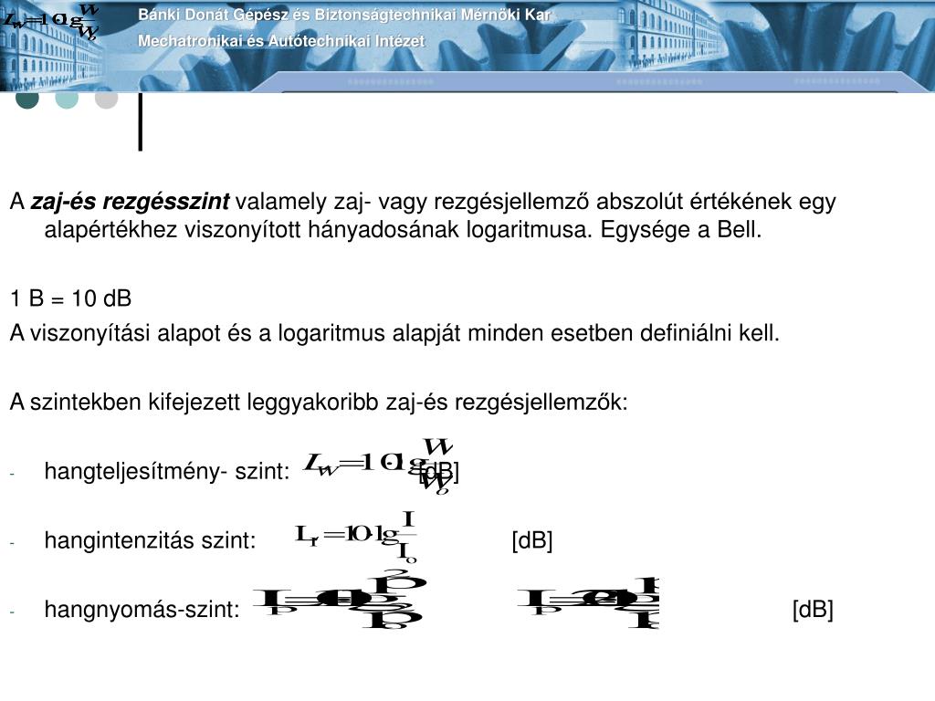 Bánki Donát Gépész és Biztonságtechnikai Mérnöki KarMechatronikai és Autótechnikai Intézet A zaj-és rezgésszint valamely zaj- vagy rezgésjellemző abszolút értékének egy alapértékhez viszonyított hányadosának logaritmusa. Egysége a Bell. 1 B = 10 dB A viszonyítási alapot és a logaritmus alapját minden esetben definiálni kell. A szintekben kifejezett leggyakoribb zaj-és rezgésjellemzők: • hangteljesítmény- szint: [dB] • hangintenzitás szint: [dB] • hangnyomás-szint: [dB]