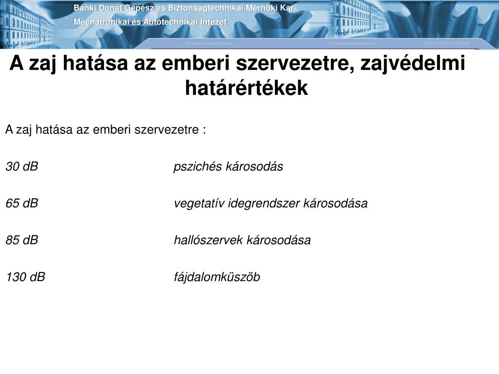 Milyen betegségeket okozhat a zajártalom? Az Irányvonalak az európai régió zajterhelésére című tanulmány új határértékként a 40 decibelt adta meg. Aki rendszeresen ennél nagyobb zajban alszik, annál alvászavar, álmatlanság jelentkezhet. A rendszeres, 55 dB feletti zajterhelés pedig magas vérnyomáshoz és szívinfarktushoz vezethet A WHO szerint az újabb kutatások az éjszakai zajterhelést egyértelműen összefüggésbe hozták az egészség károsodásával. A zaj kiélezheti a súlyos egészségi problémákat, a lehetséges következmények az alvászavartól a korai halálozásig terjednek. A repülőforgalom keltette éjszakai zaj akkor is okozhat magas vérnyomást, ha az érintettek nem ébrednek fel rá. Különösen káros, ha az emberek az elalvás szakaszában riadnak fel. A legújabb vizsgálatok kimutatták, hogy a hajnali repülési zaj felgyorsítja a szívfrekvenciát, és ezáltal kiváltképpen káros. Bánki Donát Gépész és Biztonságtechnikai Mérnöki KarMechatronikai és Autótechnikai Intézet