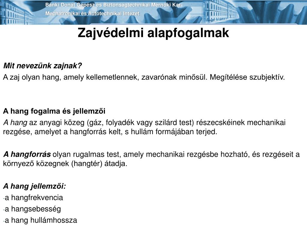 Bánki Donát Gépész és Biztonságtechnikai Mérnöki KarMechatronikai és Autótechnikai Intézet Zajvédelmi alapfogalmak Mit nevezünk zajnak? A zaj olyan hang, amely kellemetlennek, zavarónak minősül. Megítélése szubjektív. A hang fogalma és jellemzői A hang azanyagi közeg (gáz, folyadék vagy szilárd test) részecskéinek mechanikai rezgése, amelyet a hangforrás kelt, s hullám formájában terjed. A hangforrásolyan rugalmas test, amely mechanikai rezgésbe hozható, és rezgéseit a környező közegnek (hangtér) átadja. A hang jellemzői: • a hangfrekvencia • a hangsebesség • a hang hullámhossza