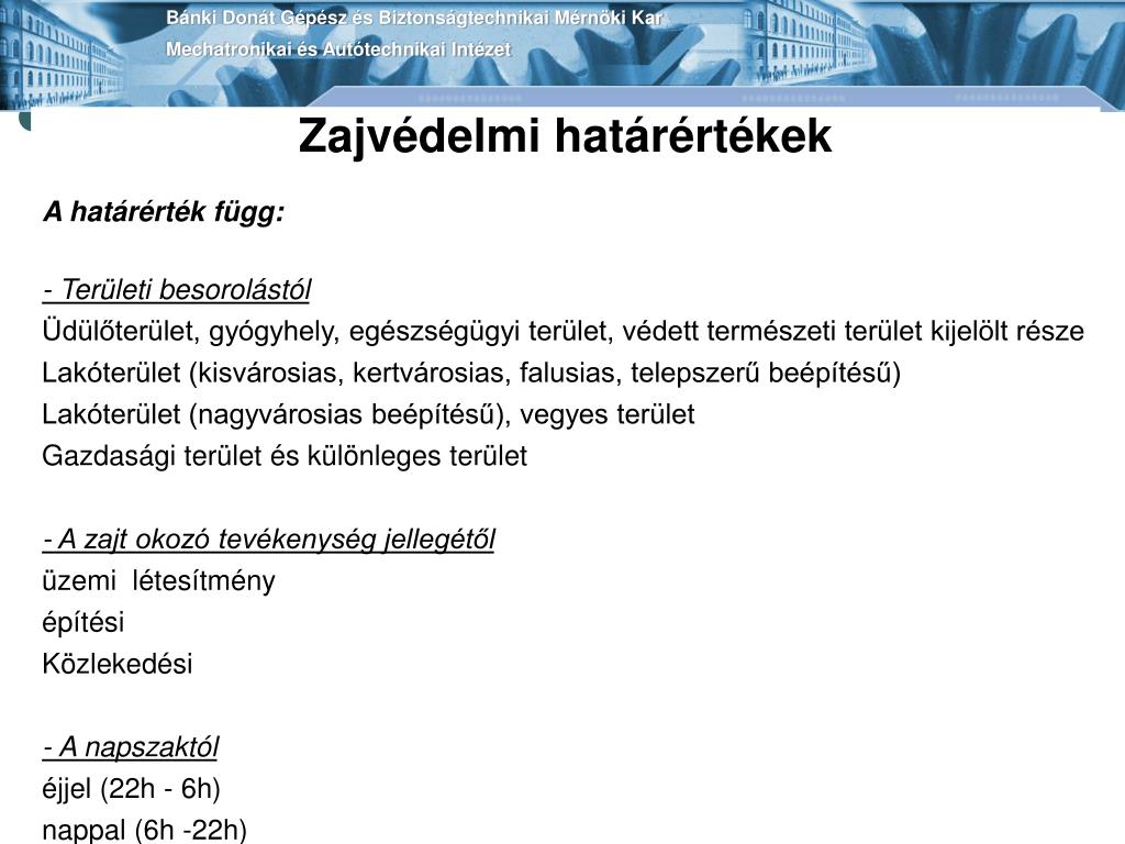 Bánki Donát Gépész és Biztonságtechnikai Mérnöki KarMechatronikai és Autótechnikai Intézet Zajvédelmi határértékek A határérték függ: - Területi besorolástól Üdülőterület, gyógyhely, egészségügyi terület, védett természeti terület kijelölt része Lakóterület (kisvárosias, kertvárosias, falusias, telepszerű beépítésű) Lakóterület (nagyvárosias beépítésű), vegyes terület Gazdasági terület és különleges terület - A zajt okozó tevékenység jellegétől üzemi létesítmény építési Közlekedési - A napszaktól éjjel (22h - 6h) nappal (6h -22h)